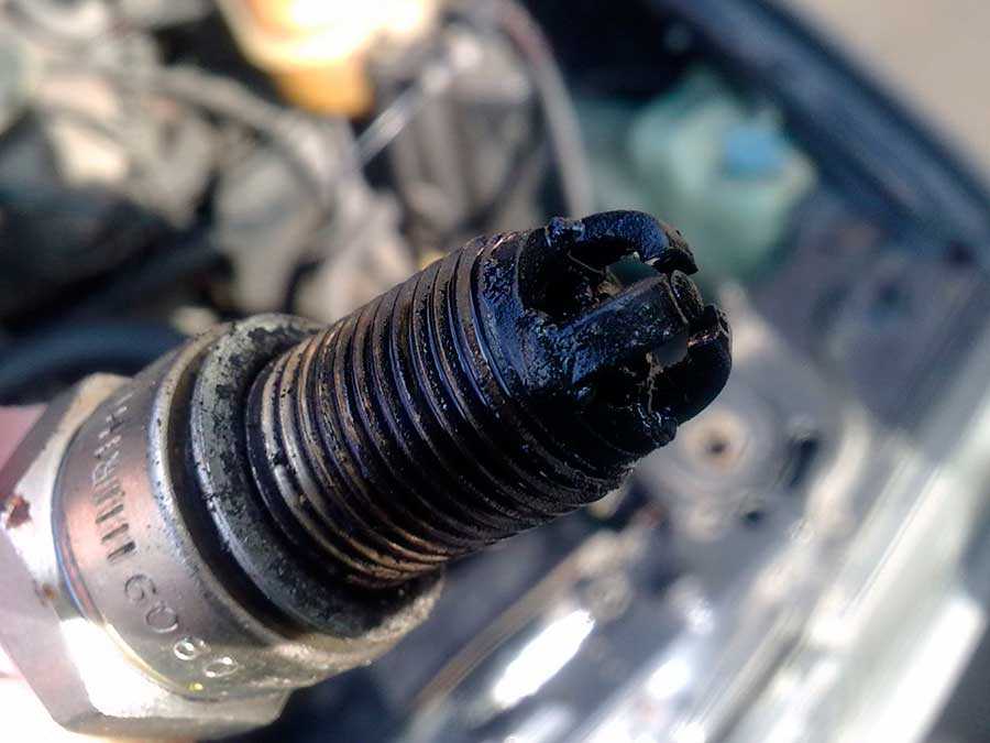 - При демонтаже залитой свечи зажигания ее резьба и электрод мокрый, в низу свечи, где вырабатывается искра, есть темный нагар.