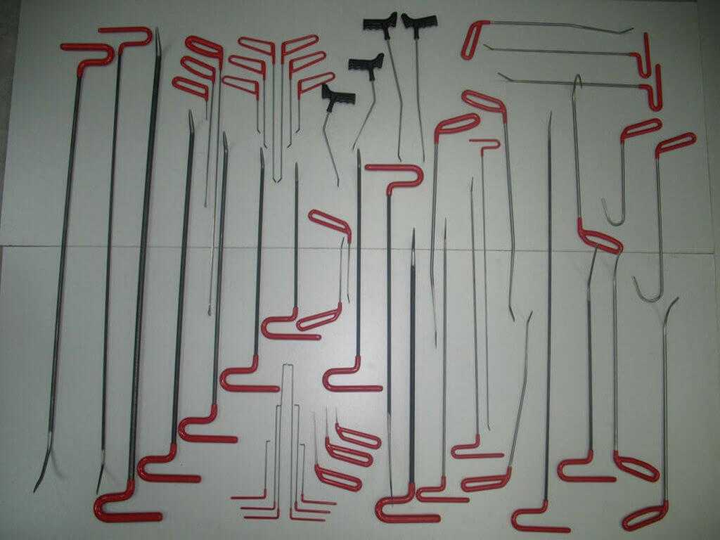 Как правило, все крюки и рычаги, применяемые при вытягивании вмятин от града, приобретаются одним комплектом. В него может входить от 10 до 40 инструментов (и чем больше, тем лучше). Производить устранение вмятин без покраски на автомобиле при помощи крюков нужно по такой схеме:
