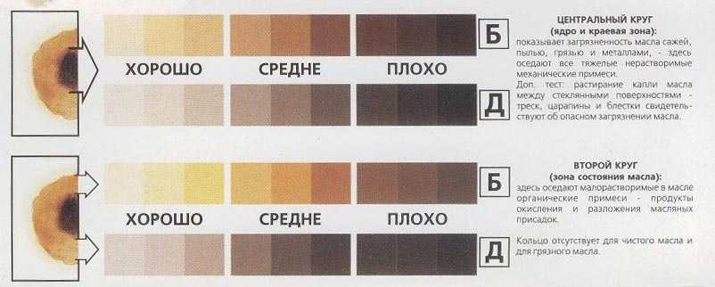 Если моторное масло сохраняет свою чистоту, то об этом свидетельствует большое светлое пятно, которое полностью исчезает уже через нескольких часов. При обводнении моторной смазки третий, четвертый элементы отличаются рваной конфигурацией на фоне отсутствия выраженных форм. Когда в зоне диффузии появляются желтые, светло-коричневые оттенки, это свидетельствует об окислении масла из-за критического перегрева силового агрегата.