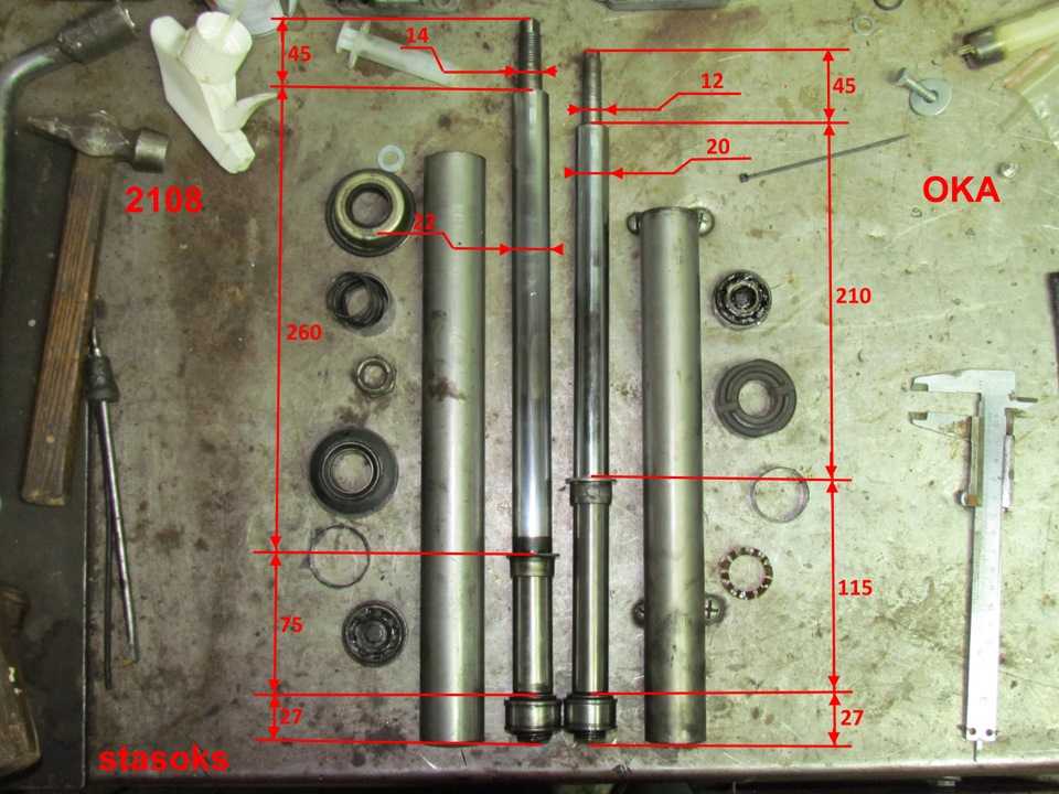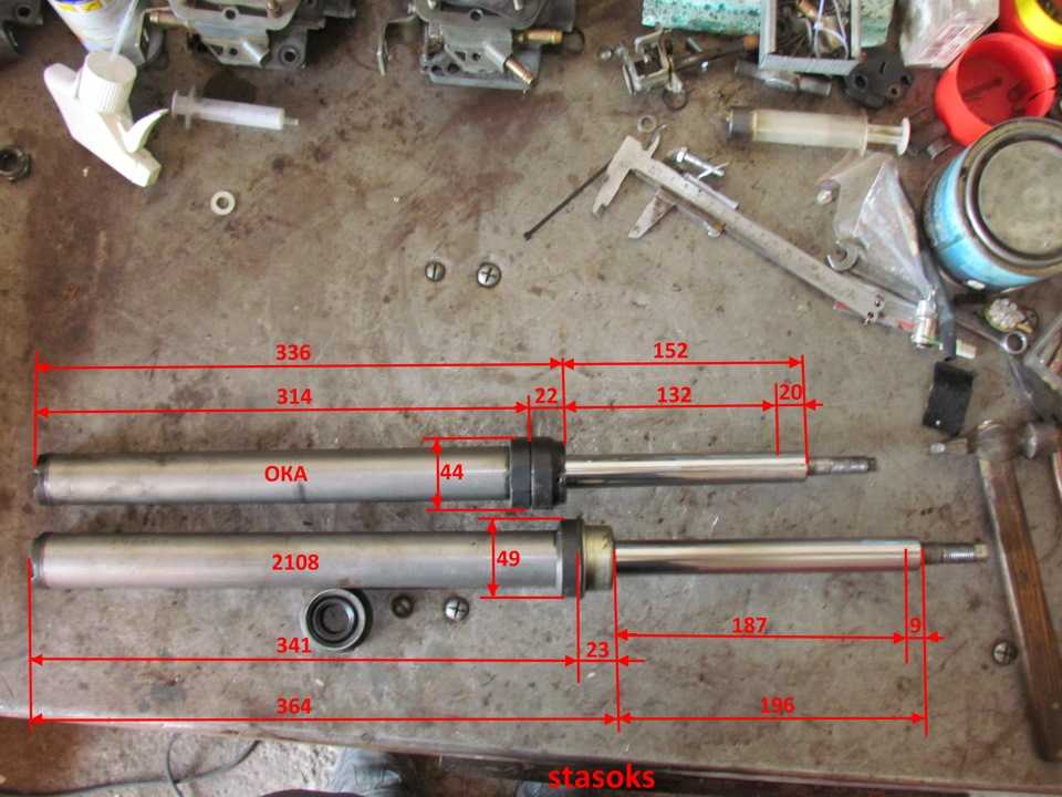 Обновление 15.03.15:Забыл про сальник на оковской вставке, фото размеров обновлены.Итого имеем:1. Ход штока:— Ока без отбойника и гайки: 132мм— Ока с отбойником и гайкой: 132+20-80-2 = 70мм (7см)— Ока с отбойником -30мм и гайкой: 132+20-50-2 = 100мм (10 см)— 2108 без отбойника и гайки: 187мм— 2108 с отбойником и гайкой: 187+9-80-6 = 110мм (11 см)2. Корпус короче на 30 мм:— в итоге можно укоротить корпус на 30мм, и ход штока будет короче всего на 10мм— уронить передок можно будет смело на 40-60мм, в зависимости какая пружина сейчас стоит.