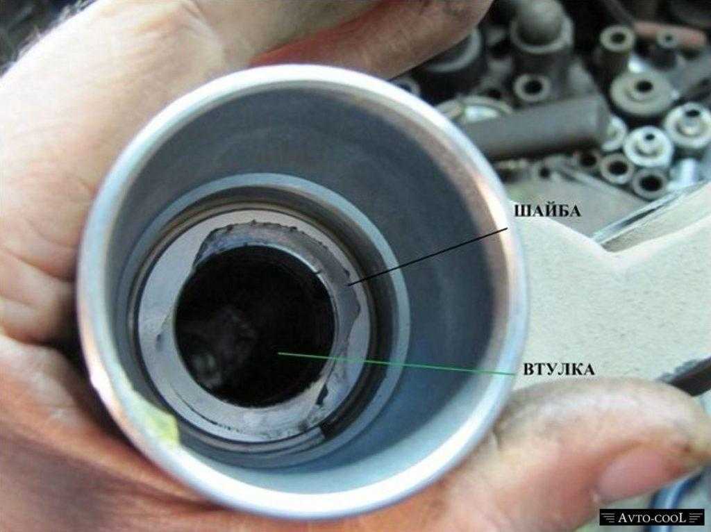 Со стороны левого торца мы увидим прижимную шайбу из алюминия, за которой прячется втулка, требующая замены. Шайба подцепляется крючком, выбивается, после чего доступ к втулке будет свободным.