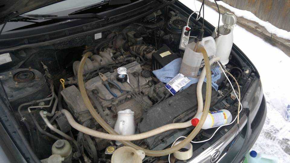 Важно помнить, что и двигатель, и вода при этом должны быть примерно одинаковойтемпературы (двигатель остывший, вода около 20 градусов). Заливаем раствор в систему