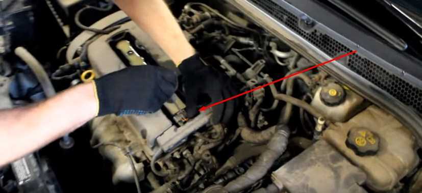 Для начала требуется открыть капот транспортного средства, после чего снять пластмассовую крышку, которая закрывает свечи зажигания и катушку. Требуется поддеть ее немного рукой или отверткой, как указано ниже на фотографии;