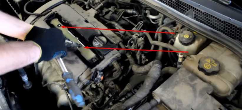 - На следующем этапе требуется открутить катушки, для этого владельцу автомобиля следует отвинтить два болта, обозначенные ниже на фотографии. Для выполнения данной процедуры ему понадобится ключ TORX T40;