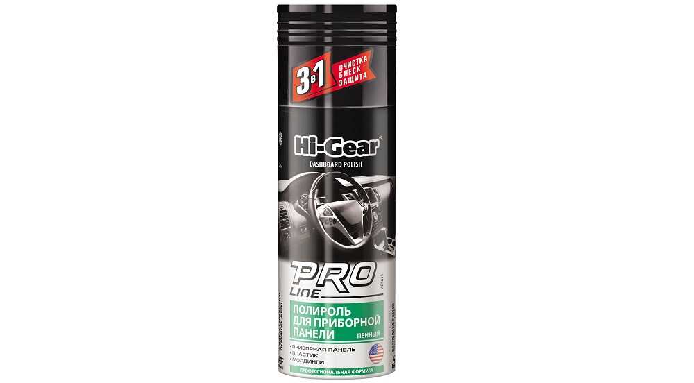 Hi-Gear Dashboard Cleaner Professional Line – полироль знаменитой американской марки, широко известная в нашей стране. Она помогает не только полировать пластик, но и очищать его от загрязнений, а также обеспечивать ему надёжную защиту от грязи и различных мелких повреждений. Состав имеет пенящуюся структуру и отличается эффективностью. Он прекрасно устраняет незначительные дефекты поверхности, отлично устраняет все виды загрязнений и защищает пластик от солнечных лучей, а также отталкивает пыль или грязь. После обработки детали приобретают обновлённый вид и великолепный блеск. Эффект держится довольно долго. Средство обладает приятным запахом, который сохраняется в салоне некоторое время. Наносить его желательно на небольшие участки, так как препарат может быстро засохнуть. Оно достаточно экономичное. Но стоит довольно дорого. Сейчас стоимость флакона составляет около 500 рублей. Кроме пластика, препаратом можно эффективно очистить и восстановить винил или резину.