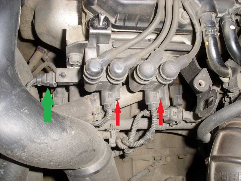 2)Отсоединяем две колодки проводов питания с катушек зажигания. Перед тем как отключать колодки — надо, указанные стрелочками на фото фиксаторы поддеть и потянуть. Лучше это сделать ножиком или плоской отверткой, но можно попробовать и пальцем. Также отключаем колодку, помеченную зеленой стрелочкой;