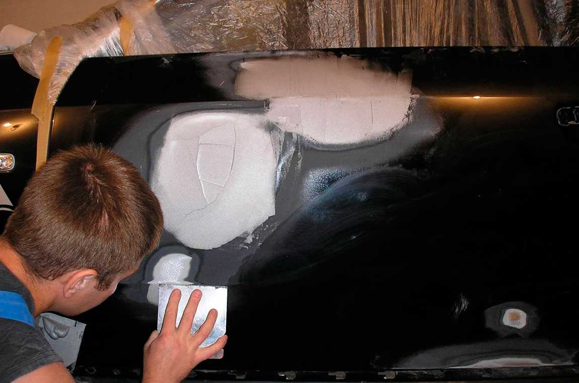 На этом этапе требуемая форма кузова выводиться при помощи различных шпатлевок. Шпатлевка наноситься шпателем на предварительно подготовленную (заматована наждачной бумагой 40-80-180 и обезжирена) поверхность.