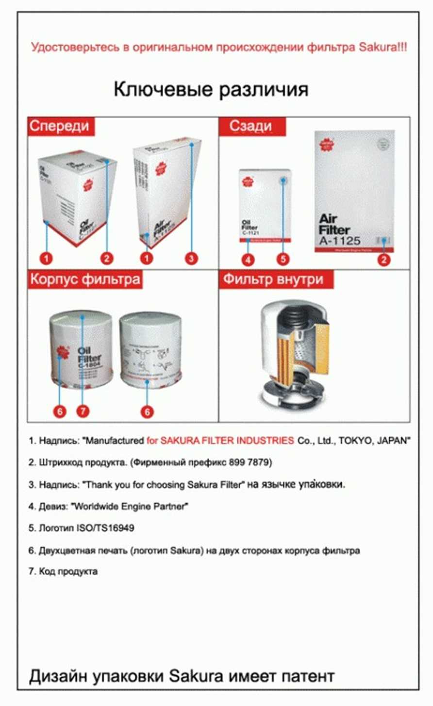 Оригинальный фильтр Sakura всегда упакован защитной пленкой. Она предотвращает попадание мусора внутрь расходника. При изготовлении подделки часто используется низкосортный полиэтилен, который слетает с фильтра в процессе хранения и транспортировки.