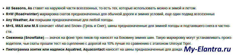 Расшифровка маркировки шин была бы не полной без учёта значений сезонности автопокрышек. Среди обозначений, соответствующих временам года, на борту можно встретить ранообразные метки.