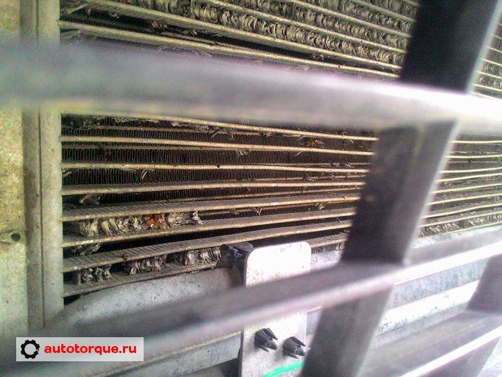 Так выглядит конденсатор кондиционера после 100 ткм. Как видите, сетка на решетке радиатора была бы очень кстати
