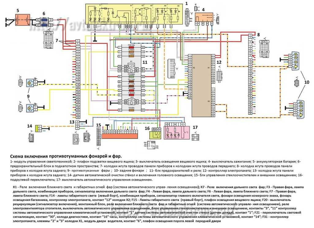 Подключение противотуманок Приоры происходит практически так же. Разница в величине сопротивления, и соответственно в значении проходящего тока. По величине тока процессор контроллера управления светотехникой определяет положение кнопки передних противотуманных фар. Поэтому если на выводе 12 колодки Х2 имеется питание, включены габаритные огни (смотри «Габариты Приора«), на вывод 19 колодки Х2 будет подано питание.