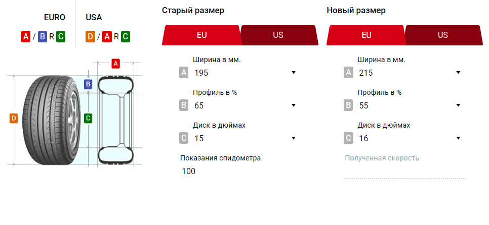 Визуальный калькулятор позволяет каждому владельцу авто без проблем определить размерность покрышек и ширину необходимых дисков. С его помощью возможно определять диаметр колес, погрешность спидометров, увеличение дорожной колеи и изменения просвет под днищем автомобиля. Посредством шинного калькулятора предельно просто определяется оптимальный размер, подходящих для конкретной модели автомобиля. Встроенная система конвертации размеров позволяет моментально трансформировать значения из дюймовой системы в метровую и обратно.