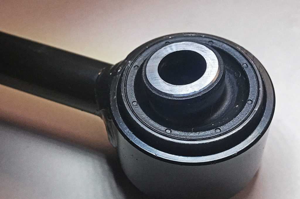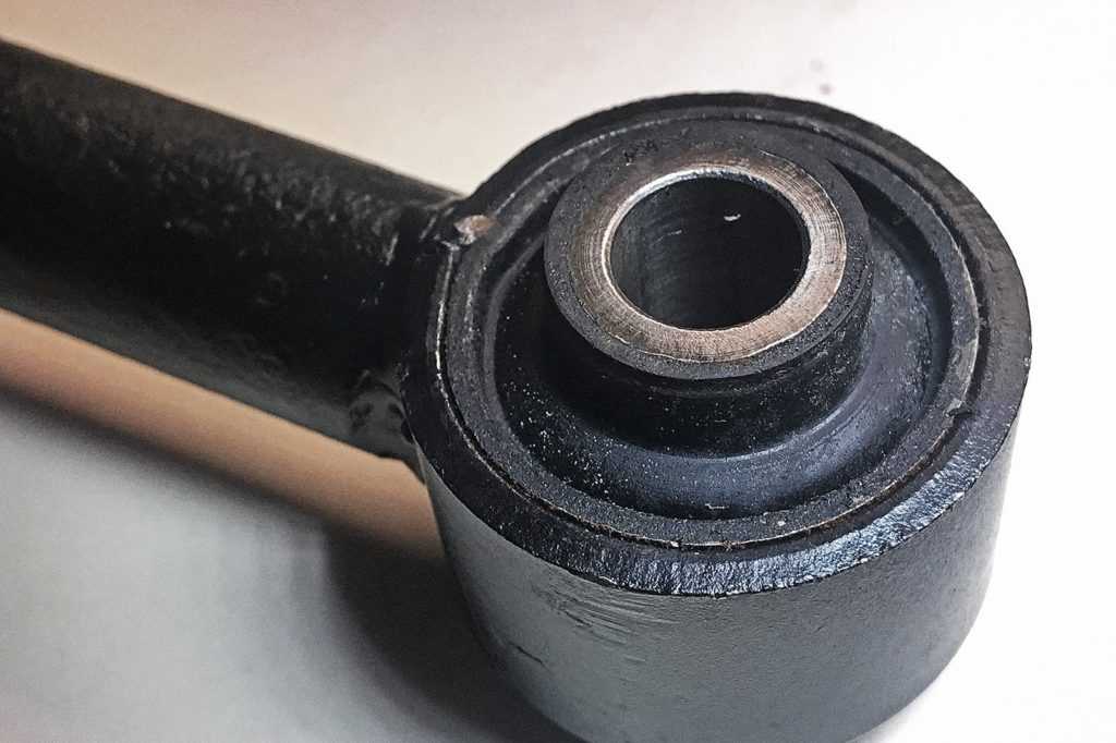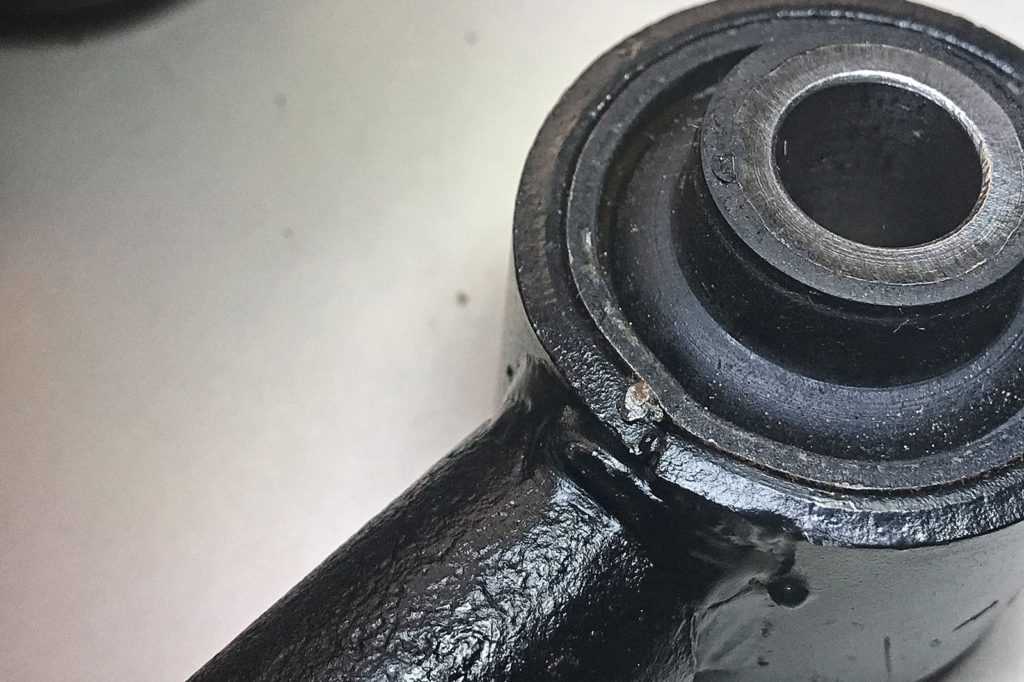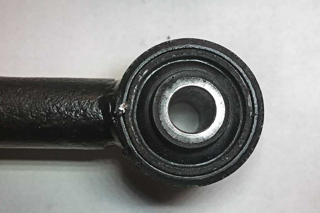 Мало того, сам сайлентблок держится внутри на честном слове. Только взгляните на этот зазор! Когда налюбуетесь, переведите взгляд на место стыка штанги с обоймой сайлентблока. Как вам такой провал?
