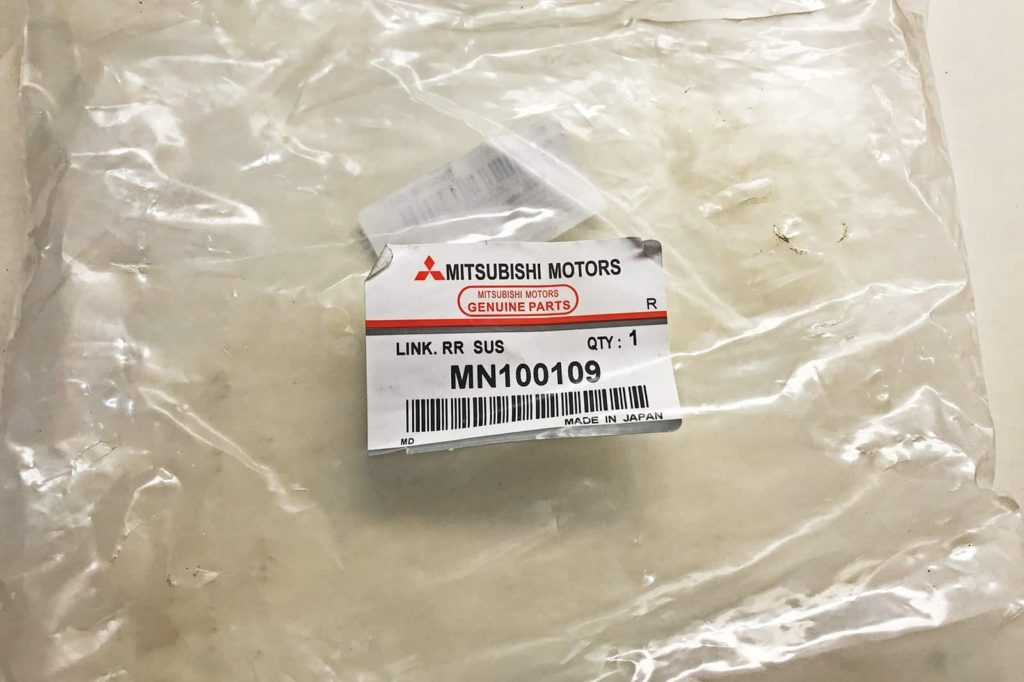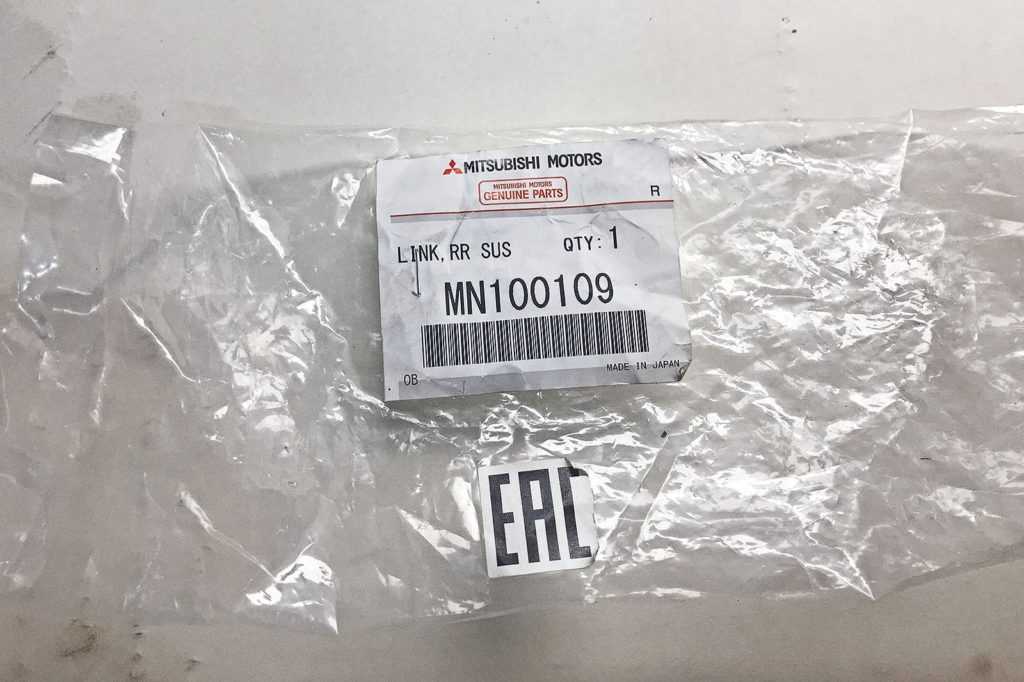 Начнём с тяги схождения MN100109, она же задняя развальная тяга для Додж Калибр, а точней с её упаковки. В оригинале это простой пакет, одна сторона запаяна, вторая зафиксирована скрепкой. Написание шрифта тонкое, сам шрифт вытянут вверх, особенно хорошо это видно на артикуле.