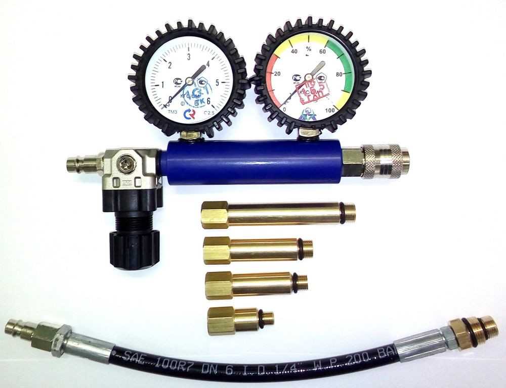 Пневмотестер герметичности цилиндров подсоединяется входным отверстием к пневмомагистрали (как правило, эту роль играет стандартный компрессор воздуха, способный развивать давление до 5. 10 атмосфер, в зависимости от используемого прибора, точное значение рабочего давления указано в инструкции по эксплуатации). Корпус пневмотестера герметичен, и присоединяется к цилиндру с помощью имеющихся в комплекте переходника и шланга. Далее во входную магистраль от компрессора подается избыточное давление значением 5. 6 атмосфер.