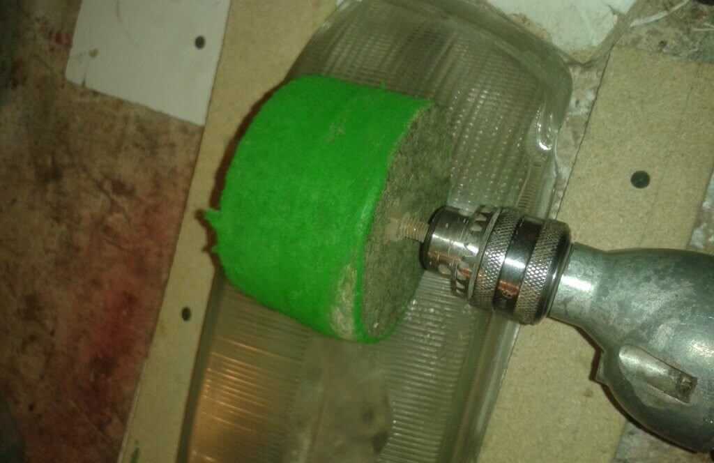 - Установите на дрель насадку с фетровым кругом. Углошлифовальную машинку или болгарку использовать нельзя — из-за высоких оборотов стекло может перегреться и лопнуть.