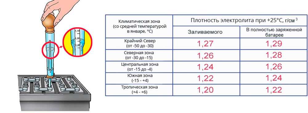 Особенность такого измерение является то, что плотность электролита в аккумуляторе зимой и летом в некоторых регионах будет разной в зависимости от сезона и среднесуточной температуры на улице. В таблице представлены данные на которые стоит ориентироваться.