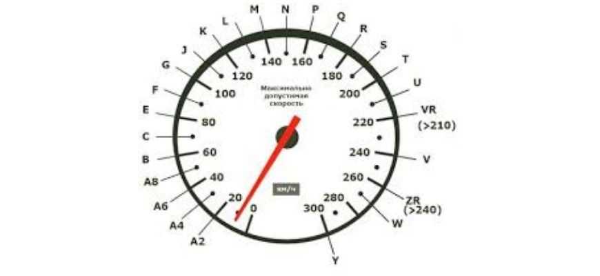 Индекс скорости шины при маркировке обозначается одной из букв латинского алфавита, которая следует сразу за индексом нагрузки. Для его расшифровки обычно также пользуются таблицей.
