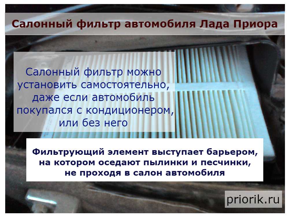 Через фильтр салона на Приоре проходит окружающий воздух, которым дышат водитель и пассажиры. Это расходный материал. Замена салонного фильтра не сложна, но покрутить гайки придется — в иномарках поменять можно гораздо проще и быстрее. Лада Приора бывает с кондиционером и без кондиционера. В следствии этого салонный фильтр на машинах меняется по разному. Подробнее об этом читайте ниже в статье! Именно салонный фильтр стоит благодарить за то, что когда вокруг пыль и грязь, не приходится испытывать дискомфорт, стараясь выхватить хотя бы немного чистого воздуха. Да он спасает от пыли. Фильтр салона принимает весь удар на себя, на его маленьких щеточках оседают пылинки и песчинки, не проходя через барьер