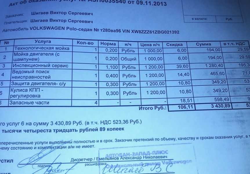 Потом по моей первой жалобе: «стук спереди»- мастер начинает раскачивать движок, на подъемнике проверяет ходовую. Вердикт: Опора КПП :(, и это уже не гарантийный случай((. Цена опоры где-то 2500руб. + замена 1500руб.Далее по второй жалобе:»плохое включение 1 передачи» -отрегулировали КПП, сказали что все отлично, все работает, но как была проблема так она и осталась надо просто свыкнуться. Кстате перед тем как отрегулировать КПП сняли аккумулятор показали ту самую опору подушки КПП.Затем заменяют каркасы сидений, время замены около 30 мин. мастер сознался что это не самое благоприятно занятие и эта проблема только у Поло седан (.Диагностика электроники показала что ошибок нет, я рад! Иду еще раз подписывать документы и получать автомобиль.После подписания документов ждал приятный сюрприз, бонусная карта на 3% по которой мне сделали скидку на прохождение ТО и на запчасти. Купил так же краску с лаком, очень надо, осталось только подождать недельку-другую.