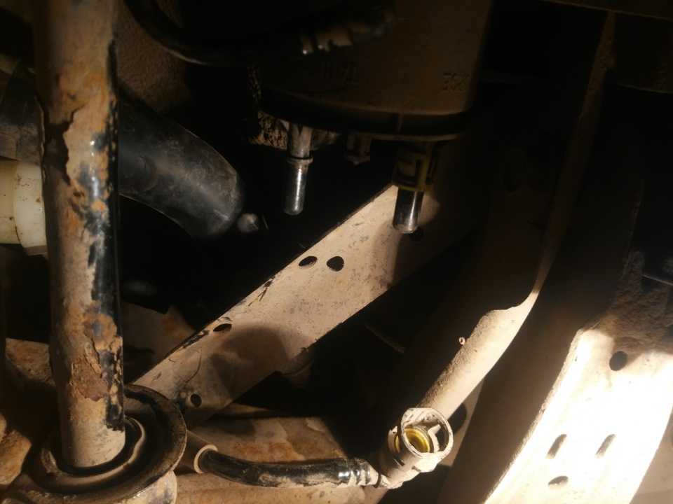 - Под бензобак установить опору. Вывернуть болт крепящий хомут бака к кузову спереди, затем два болта в задней части.