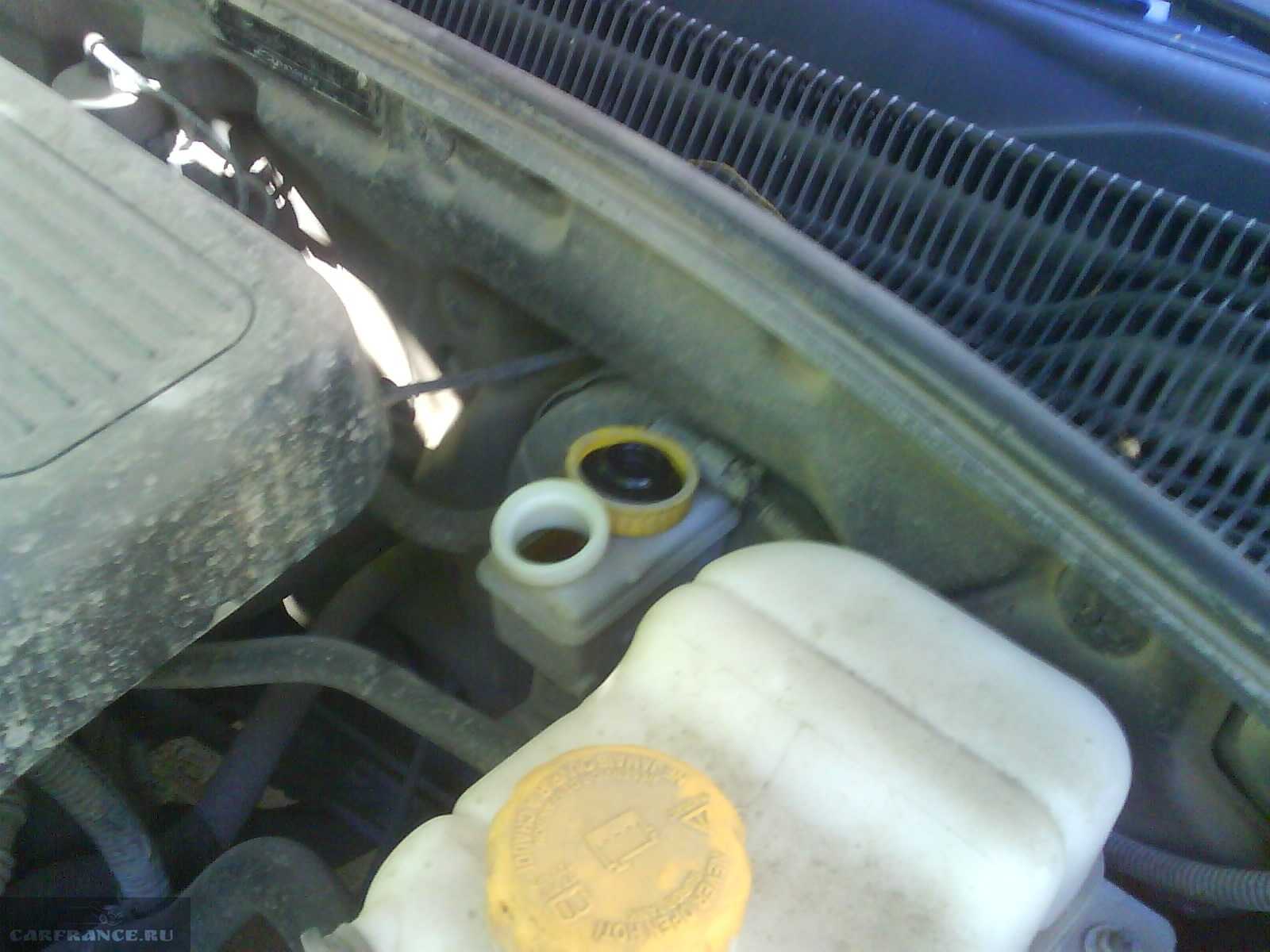 Открываем капот, находим бачок тормозной системы (он же и для сцепления) и шприцем отбираем жидкость примерно до половины. Это делается для того, чтобы, когда мы будем утапливать поршень в цилиндр суппорта, жидкость не вытекла через верх бачка.