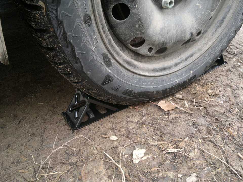 1. Затормозите автомобиль стояночным тормозом и установите противооткатные упоры («башмаки») под задние колеса.