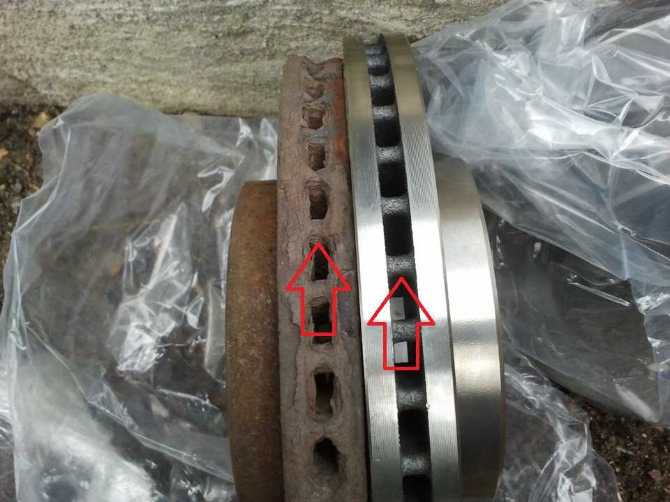 5. Осмотрите перемычки воздушных каналов охлаждения диска. При обнаружении трещин в перемычках диск подлежит обязательной замене (для наглядности показан старый и новый тормозной диск).