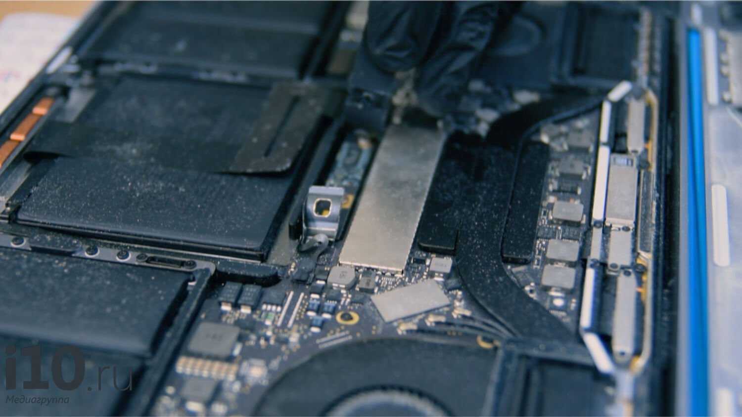 Теперь, когда макбук обесточен, выполняется чистка MacBook Pro с помощью щётки и сжатого воздуха. Разница видна сразу (посмотрите, на аккумуляторе ещё есть грязь, а сверху её уже убрали).