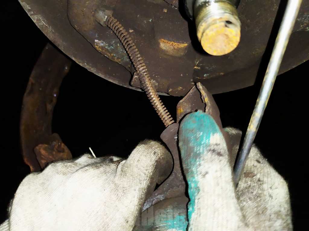 - Натяните пружинку снизу. На этом этапе установите регулятор зазора таким образом, чтобы барабан натянулся на колодки с небольшой «тягой».