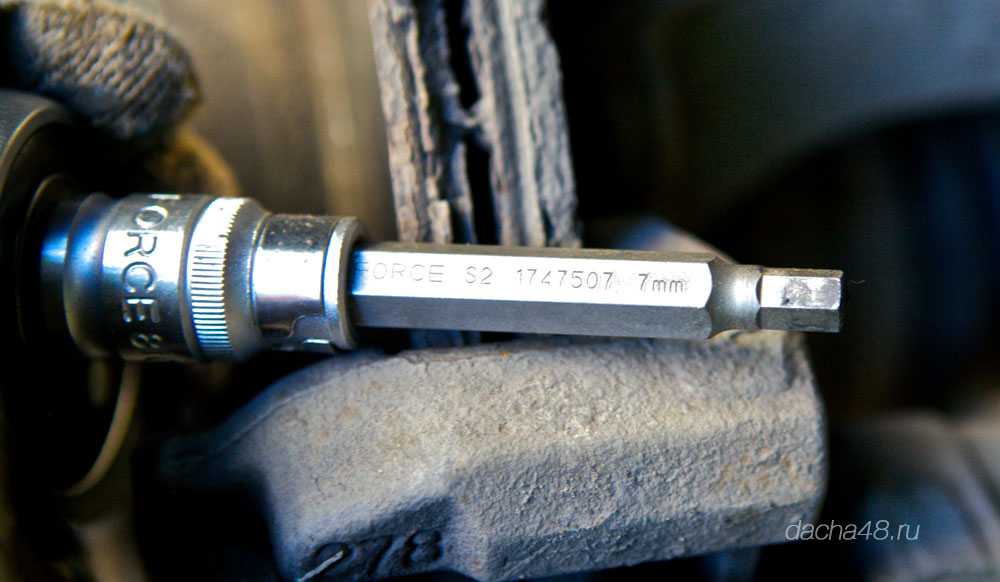 Берём шестигранник 7 мм и откручиваем направляющую суппорта которая находится под заглушкой, которую мы сняли ранее.