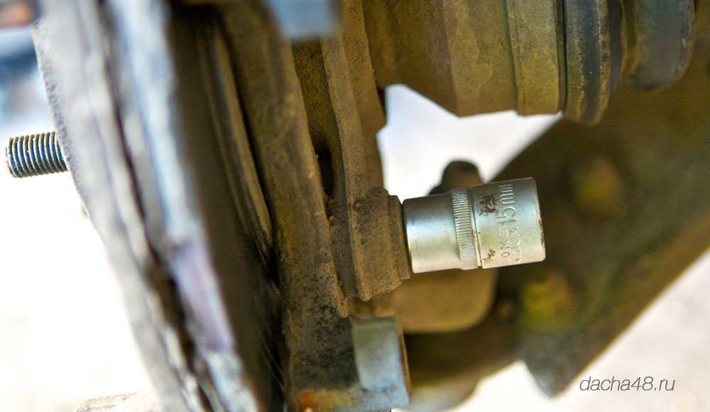 После этого подвижную часть суппорта вместе с колодками можно легко снять и надёжно закрепить проволокой. Чтобы освободить тормозной диск необходимо открутить неподвижную часть суппорта. Она прикручена двумя болтами. Открутить её можно головкой на 15 мм.