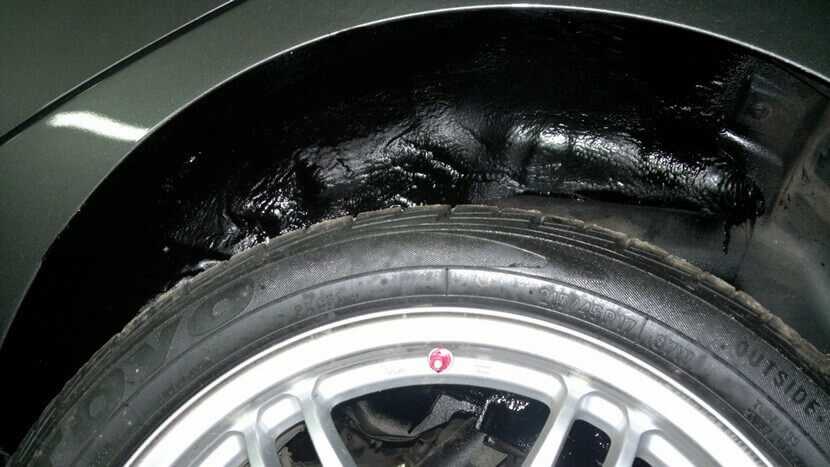 - Тщательно и равномерно нанести на все колесные арки жидкие подкрылки. При этом слой должен иметь толщину не более 3 мм и быть полностью однородным и равномерным.