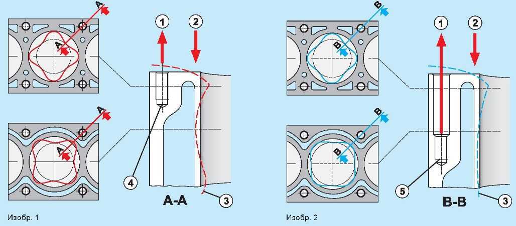 1. Усилие болта болтов крепления головки блока цилиндров /2. Уплотняющее усилие между головкой блока цилиндров и её уплотнением / 3. Деформация цилиндра (представлено очень утрированно) / 4. Находящаяся вверху резьба болта /5. Глубоко лежащая резьба болта