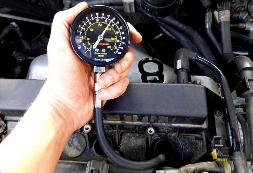 Компрессометр вставляется в отверстие, расположенное на свече нездорового цилиндра. Включается зажигание с постепенным повышением оборотов движка. Показания снимаются несколько раз. Заниженная компрессия говорит об износе клапана или же поршня либо его колец. Для определения поломки потребуется делать разборку двигателя.