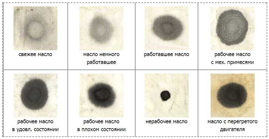 Проверить состояние масла можно по капле с масляного щупа двигателя. Необходимо один раз капнуть на лист бумаги и подождать 15 минут, пока капля пропитается и сформирует четкое пятно. Теперь просто сравниваем полученный образец с представленными в таблице ниже.