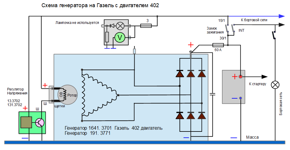 Аккумулятор становится потребителем и начинается зарядка, обмотка возбуждения генератора питается по той же цепи, только теперь не от аккумулятора, а от выхода генератора. Если есть пробой или обрыв, то обмотку придется заменить проще заменить генератор Проверяем обмотку ротора. Вал ротора вращается в шариковых подшипниках, установленных в крышках. Позвонив знакомому электрику, он сказал два заветных слова и все встало на свои места — Поставь лампочку! После данной процедуры, пришлось немного выправлять крыльчатку. Для срыва и затяжки гайки этого приспособления оказалось достаточно. Как подключить генератор на змз 402