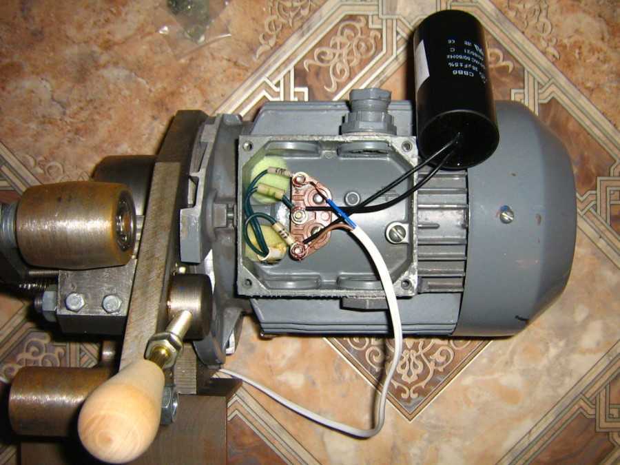 Чаще всего используется подключение мотора электрического под 220/380В с имеющимся конденсатором, посредством которого снижается мощность. Конденсаторный контакт следует присоединить к нулю, при этом другой – к следующему выходу двигателя. В итоге получается минимальной мощности устройство.