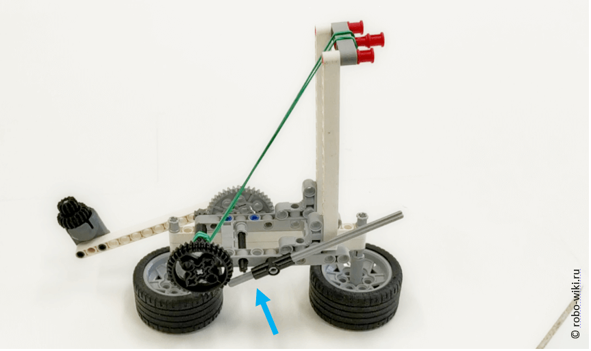 В примере с катапультой на противоположном конце от собачки установлен длинный рычаг. Под весом длинного конца рычага собачка упирается в зубчатое колесо и блокирует вращение оси. Катапульта выстрелить не может. Стоит надавить на длинный рычаг вверх и собачка выйдет из зацепления, разблокировав ведущую ось.
