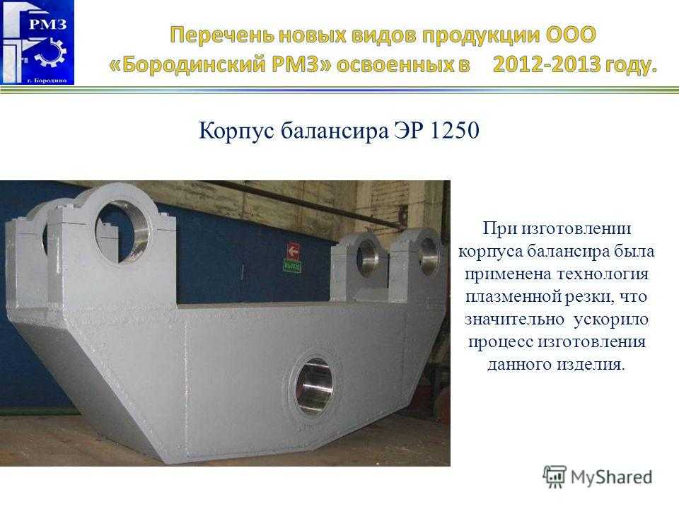 При изготовлении корпуса балансира была применена технология плазменной резки, что значительно ускорило процесс изготовления данного изделия. Корпус балансира ЭР 1250