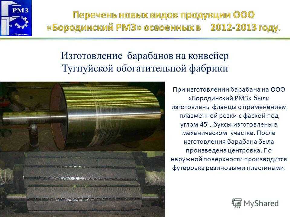 Изготовление барабанов на конвейер Тугнуйской обогатительной фабрики При изготовлении барабана на ООО «Бородинский РМЗ» были изготовлены фланцы с применением плазменной резки с фаской под углом 45°, буксы изготовлены в механическом участке. После изготовления барабана была произведена центровка. По наружной поверхности производится футеровка резиновыми пластинами.