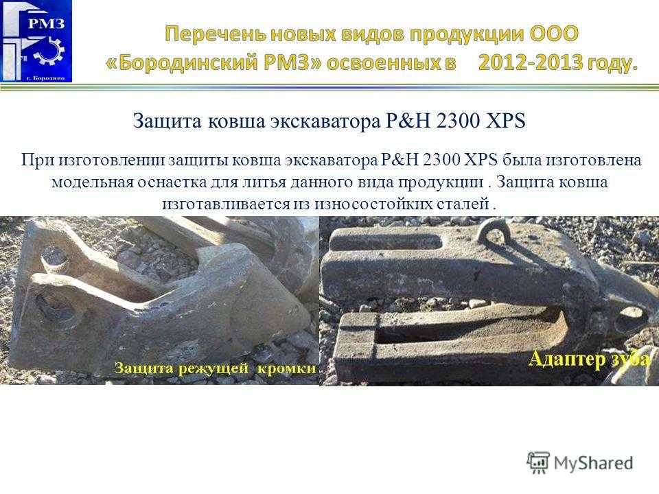 Защита ковша экскаватора P&H 2300 XPS При изготовлении защиты ковша экскаватора P&H 2300 XPS была изготовлена модельная оснастка для литья данного вида продукции. Защита ковша изготавливается из износостойких сталей.