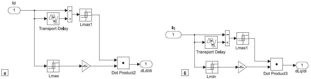Модели блоков dif_d и dif_q показаны на рис. 11. В них учитывается знак производной при возрастании и убывании тока.