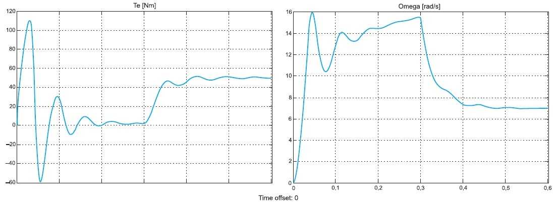 При пуске на холостом ходу в момент времени (t = 0) электромагнитный момент и скорость имеют колебательный характер. Аналогичный характер переходного процесса имеет место при приложении внешнего нагрузочного момента (t = 0,3 c).
