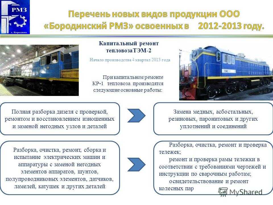 Капитальный ремонт тепловозаТЭМ-2 При капитальном ремонте КР-1 тепловоза производятся следующие основные работы: Полная разборка дизеля с проверкой, ремонтом и восстановлением изношенных и заменой негодных узлов и деталей Замена медных, асбостальных, резиновых, паронитовых и других уплотнений и соединений Разборка, очистка, ремонт, сборка и испытание электрических машин и аппаратуры с заменой негодных элементов аппаратов, шунтов, полупроводниковых элементов, датчиков, ламелей, катушек и других деталей Разборка, очистка, ремонт и проверка тележек; ремонт и проверка рамы тележки в соответствии с требованиями чертежей и инструкции по сварочным работам; освидетельствование и ремонт колесных пар Начало производства 4 квартал 2013 года