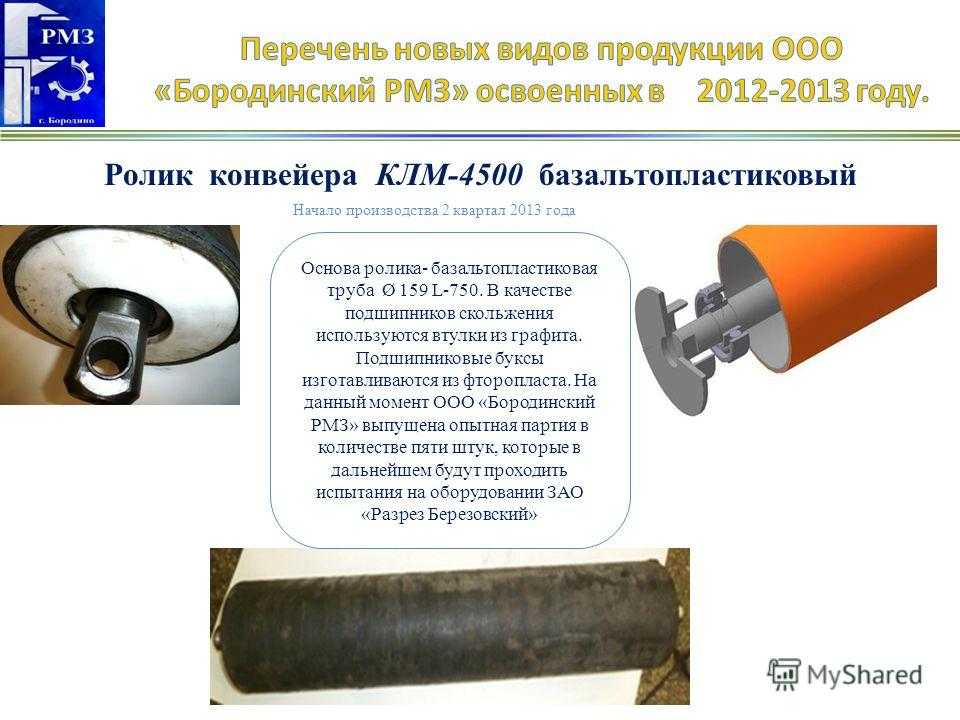 Ролик конвейера КЛМ-4500 базальтопластиковый Начало производства 2 квартал 2013 года Основа ролика- базальтопластиковая труба Ø 159 L-750. В качестве подшипников скольжения используются втулки из графита. Подшипниковые буксы изготавливаются из фторопласта. На данный момент ООО «Бородинский РМЗ» выпущена опытная партия в количестве пяти штук, которые в дальнейшем будут проходить испытания на оборудовании ЗАО «Разрез Березовский»