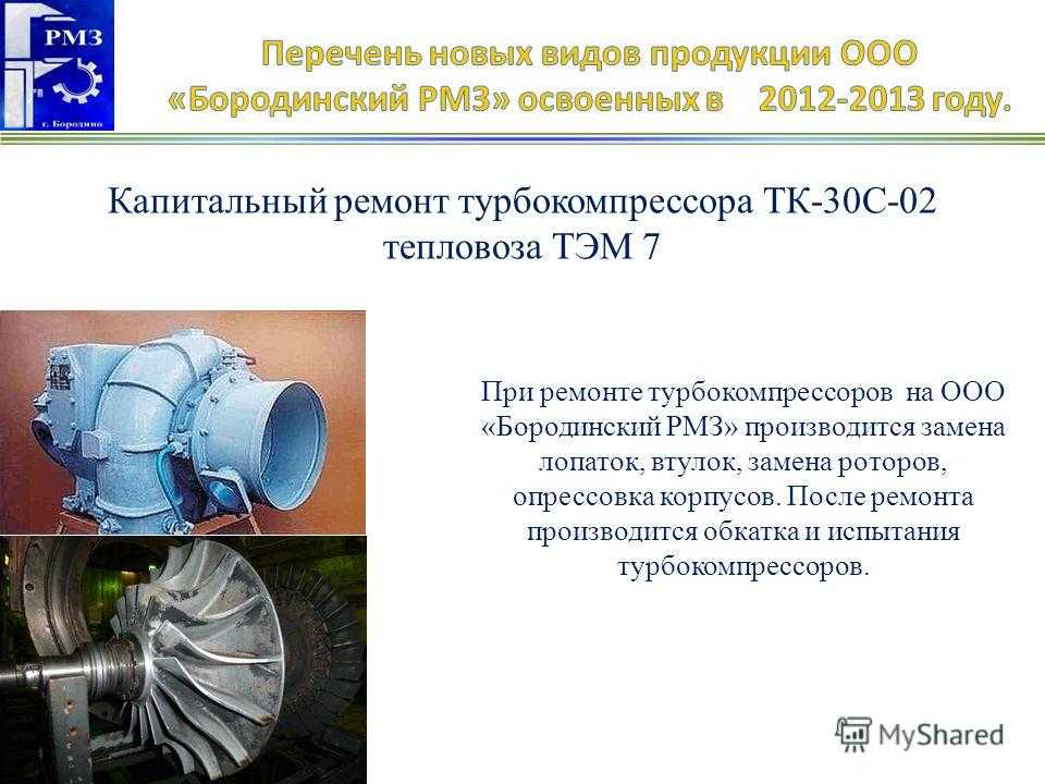 Капитальный ремонт турбокомпрессора ТК-30С-02 тепловоза ТЭМ 7 При ремонте турбокомпрессоров на ООО «Бородинский РМЗ» производится замена лопаток, втулок, замена роторов, опрессовка корпусов. После ремонта производится обкатка и испытания турбокомпрессоров.