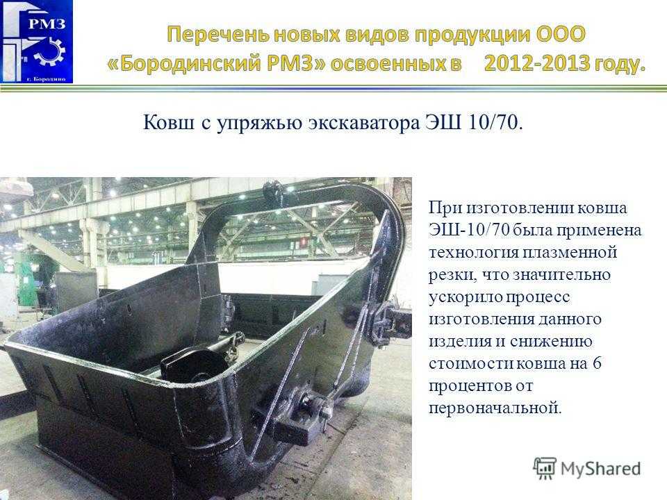 Ковш с упряжью экскаватора ЭШ 10/70. При изготовлении ковша ЭШ-10/70 была применена технология плазменной резки, что значительно ускорило процесс изготовления данного изделия и снижению стоимости ковша на 6 процентов от первоначальной.