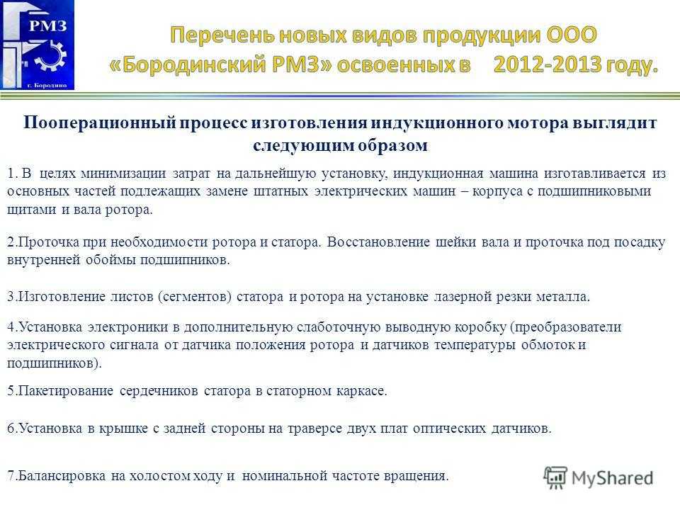 Пооперационный процесс изготовления индукционного мотора выглядит следующим образом 1. В целях минимизации затрат на дальнейшую установку, индукционная машина изготавливается из основных частей подлежащих замене штатных электрических машин – корпуса с подшипниковыми щитами и вала ротора. 2. Проточка при необходимости ротора и статора. Восстановление шейки вала и проточка под посадку внутренней обоймы подшипников. 3. Изготовление листов (сегментов) статора и ротора на установке лазерной резки металла. 4. Установка электроники в дополнительную слаботочную выводную коробку (преобразователи электрического сигнала от датчика положения ротора и датчиков температуры обмоток и подшипников). 5. Пакетирование сердечников статора в статорном каркасе. 6. Установка в крышке с задней стороны на траверсе двух плат оптических датчиков. 7. Балансировка на холостом ходу и номинальной частоте вращения.