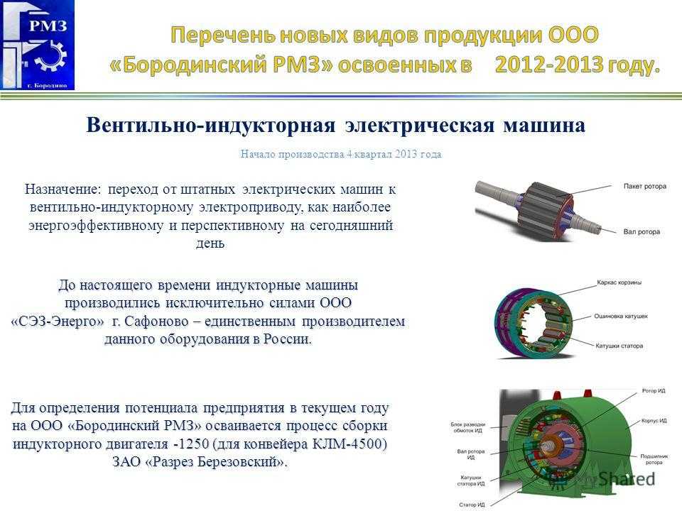 Вентильно-индукторная электрическая машина Начало производства 4 квартал 2013 года До настоящего времени индукторные машины производились исключительно силами ООО «СЭЗ-Энерго» г. Сафоново – единственным производителем данного оборудования в России. Для определения потенциала предприятия в текущем году на ООО «Бородинский РМЗ» осваивается процесс сборки индукторного двигателя (для конвейера КЛМ-4500) ЗАО «Разрез Березовский». Назначение: переход от штатных электрических машин к вентильно-индукторному электроприводу, как наиболее энергоэффективному и перспективному на сегодняшний день